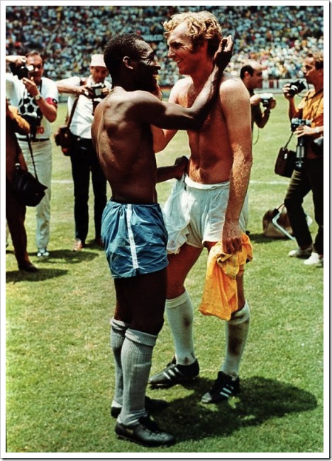 O memorável gol de Jairzinho deu a vitória ao Brasil por 1-0, mas este jogo ainda teve mais um momento icônico para oferecer: de Pelé e Bobby Moore, o grande atacante e o grande defensor, trocando suas camisas. O que faz do momento tão atemporal, é que você dificilmente pode dizer quem ganhou e quem perdeu com base no toque, nos sorrisos e nos olhos dos dois atletas. ![]()