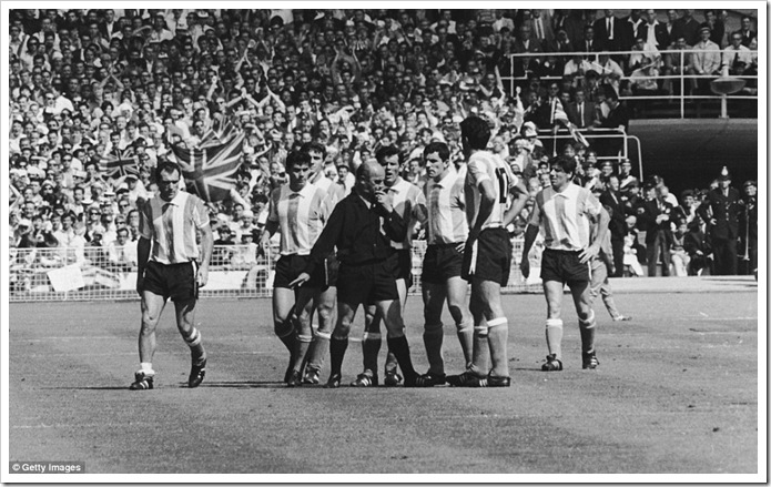 Aos 37 minutos do primeiro tempo, Rattin, o capitão argentino, reclamou da violência inglesa (quem diria) para o árbitro alemão Rudolf Kreitlein e foi expulso. Kreitlein deve ter expulsado o argentino em alemão, porque, Rattin, não entendo nada do que acontecia ou usando a conhecida catimba portenha, permaneceu em campo até que o árbitro, com gestos, lhe indicou o caminho do vestiário.